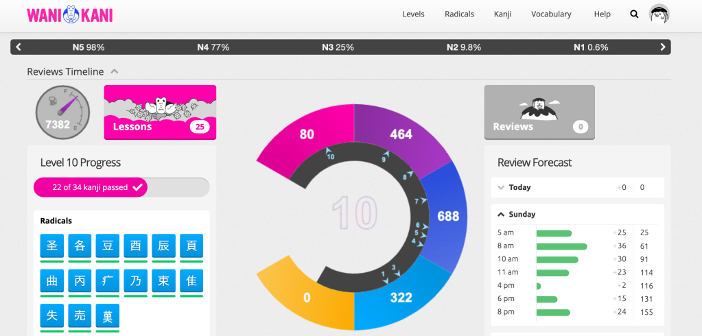 I’m level 11 at the time of writing this and I can’t wait to see how I’m feeling when I get back to level 25. I hope it will be less torturous because I’ve spaced myself out more and I have a better way of coping with large amounts of lessons and reviews. I’m more comfortable with seeing numbers rather than having a 0 lessons and 0 reviews counter at the end of the day, which helps a lot! My goal is level 60 of course (why else would I have bought a lifetime membership?!), and I would like to get there without taking an extended break.